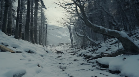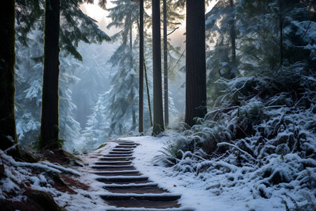a captivating photo of a wooden path covered in snow, reminiscent of atmospheric and moody landscapes found in unreal engine 5. shot with a voigtlander bessa r2m, this cinematic still captures the sublime wilderness with its captivating beauty. ai generated