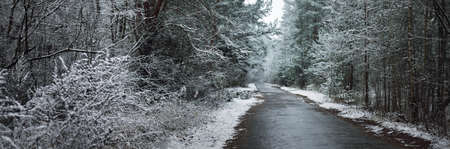 Beautiful winter forest landscape with road and trees covered with fresh snow