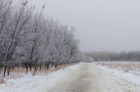 Landscape with beautiful fog. Dirt road go through on a mysterious winter forest, Magical and mystical atmosphere.