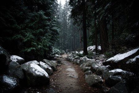 A forest path winds through towering trees with a somber atmosphere. The scene displays a variety of shades with the trail of rocks and snow. The image could be used for editorial purposes or to illustrate concepts such as exploration and nature.