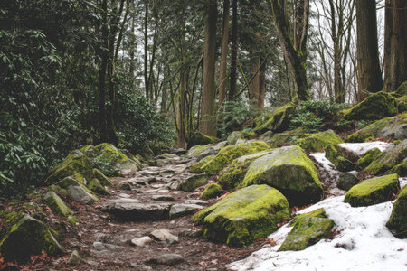 A stone path leads through a dense forest, featuring moss-covered rocks and towering trees. The scene showcases a combination of green foliage, brown earth, and hints of white snow. This natural landscape could be used in various applications, including editorial content and website design.