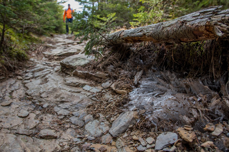 Lonely winter mountain hiking. A hiker is walking along a mountain path. Traveling alone to balance the mind and mental health. Escape from the hustle and bustle of the big city. Offline.