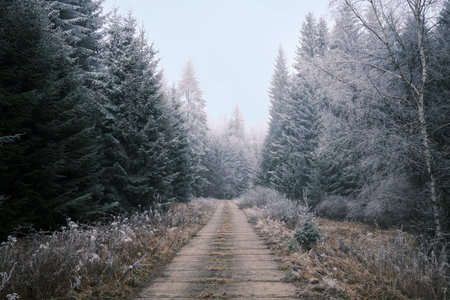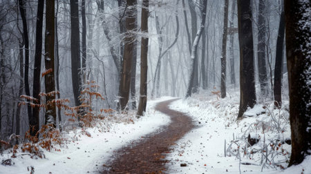 Snowy forest path through a misty winter wonderland