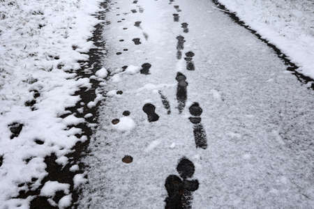 Footprints on the asphalt covered with white snow.