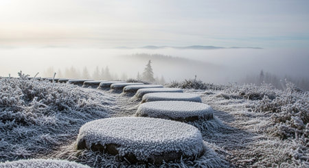 Frost-covered stepping stones lead along a path through a misty, serene winter landscape with distant hills.