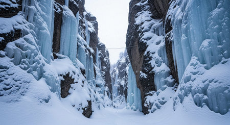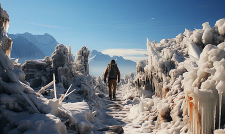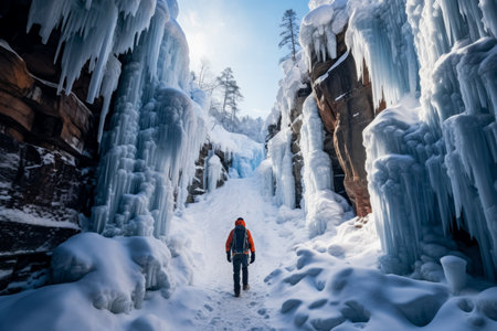 Daring hiker navigating frozen waterfall amidst snowy winter wilderness