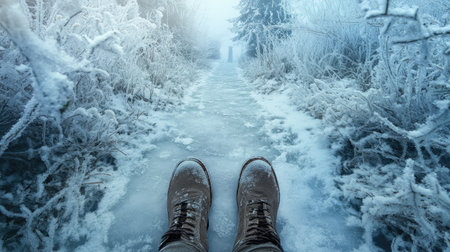 Trekking boots on an iced river