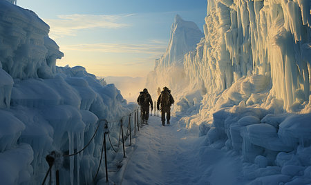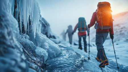 Group of climbers making their way up a snowy mountain with impressive ice formations around them