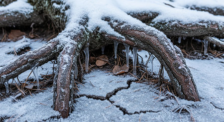 Tree roots are covered in snow with small icicles hanging in the winter ground Clear details and vibrant color...