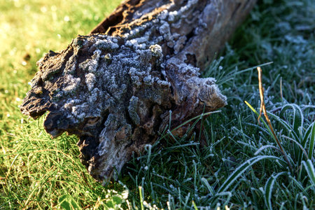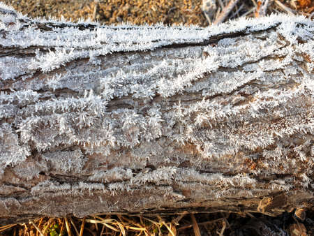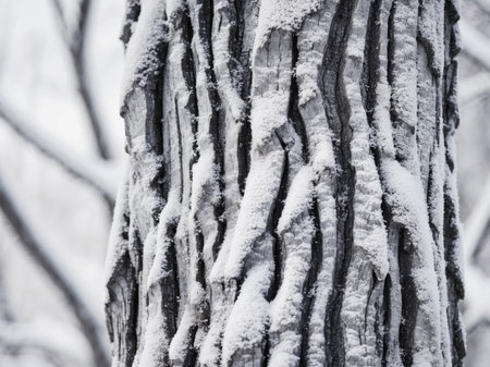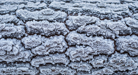 Detailed close-up of rough tree bark covered in a delicate layer of white frost. Clear details and vibrant col...