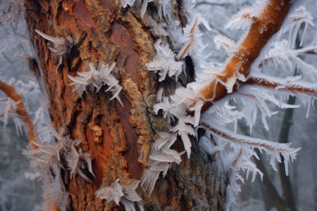 ice-encrusted tree trunk close-up, created with generative ai