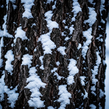 AI Generated. Closeup of Textured Tree Bark with Soft Snowy Accents in Winter Nature