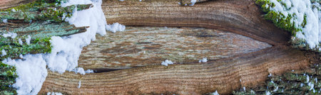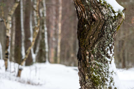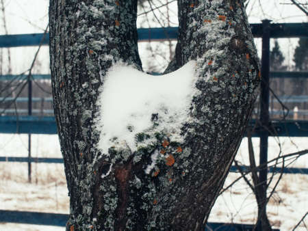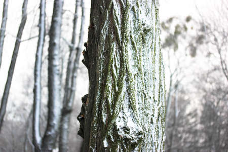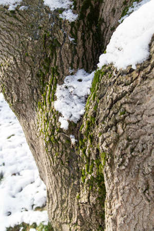 Tree trunk with bark covered with snow. Interesting shape of wood. Texture, weather background