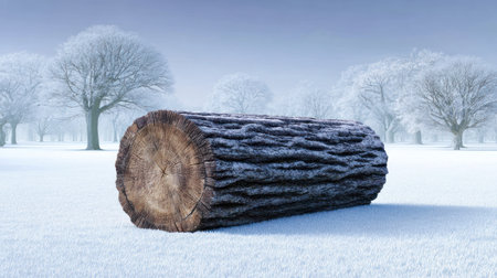 Thick, cylindrical piece of harvested wood lies on a snow-covered field. The background features several deciduous trees heavily coated in white frost or snow under a pale, cool blue sky, suggesting a very cold, clear winter day.