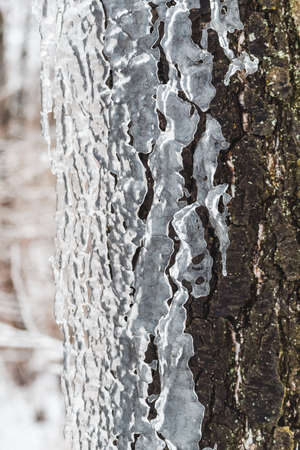 Ice curtain hanging on a tree trunk in winter