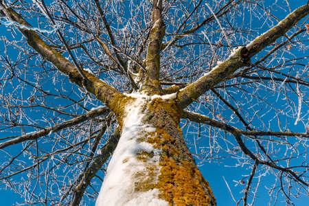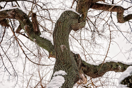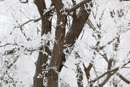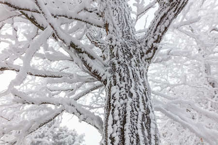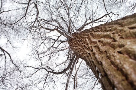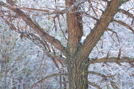 Closeup of a mulbery tree covered by fresh snow on it during the cold winter, in Kiev, Ukraine