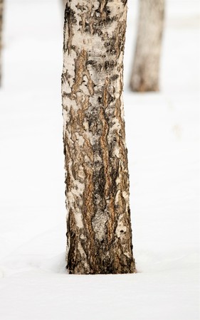 trunk of a birch in the winter in snow