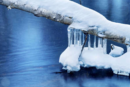 Icicles on tree branch. Icicles above the surface of the water on birch tree trunk.