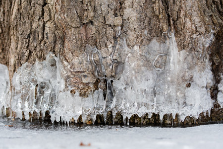 Roots and bark of a tree wrapped in ice in winter