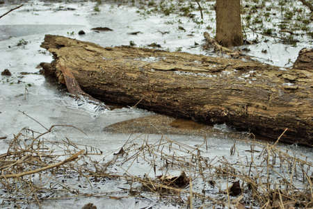 Wooden log is lying on the ground near cracked ice in the forest.