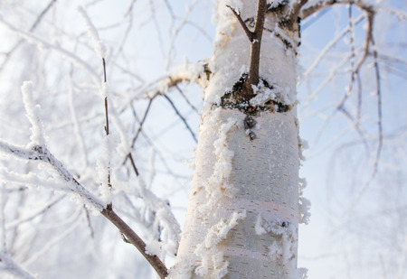 frost and ice covered tree stem in winter