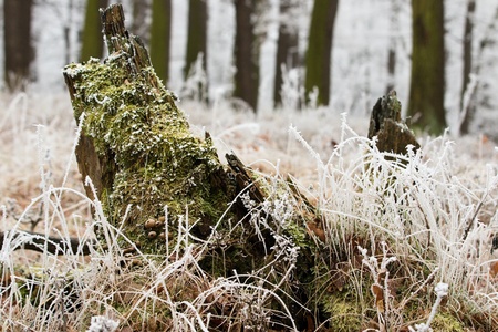 Frozen moss and grass on tree stump