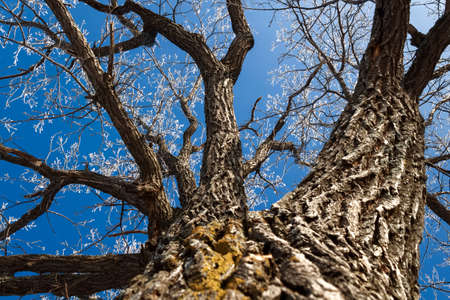 The trunk of an old oak tree is covered with frost against the blue sky.