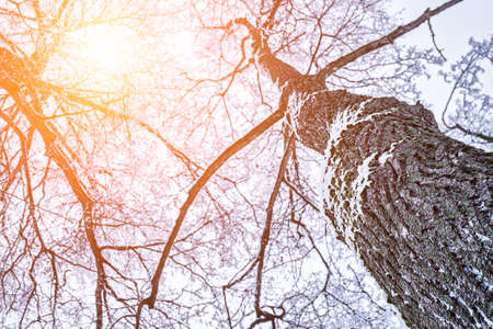 Trees in winter. Frost on the branches of trees. Snow on the trees. Trees and plants in winter frost. Low angle view.