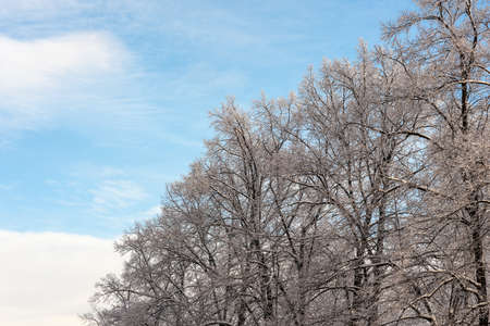 abstract background of deciduous trees covered with snow and frost in the winter. Vertical Photo with blue sky in the background