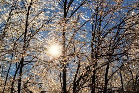 A background of the sun shining behind ice covered tree branches producing a beautiful sparkling glow after an ice storm during the winter season.