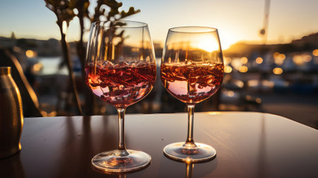 Wine glass reflection sunset in wine water drops on surface contemplation beauty inner peace Abstract background