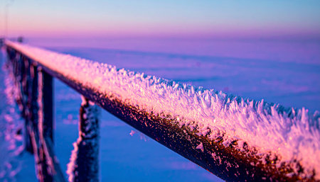 Realistic macro close-up of snow park metal rail with frost crystals and icy textures under soft morning light, minimal winter sports concept, no humans, no text.