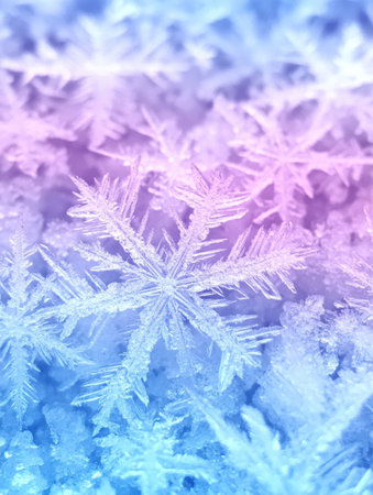 Macro view of intricate frost patterns resembling snowflakes on a dark surface with a color gradient.