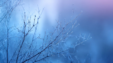 Delicate branches covered in frost create a serene scene during twilight. The soft blue hues enhance the peaceful atmosphere of the winter evening.