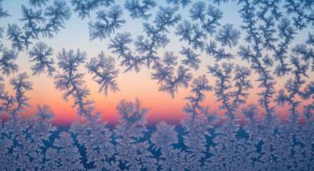 A mesmerizing view through a frost-covered window, revealing a vibrant sunset sky painted with hues of orange, pink, and blue. Intricate ice crystals form delicate patterns.
