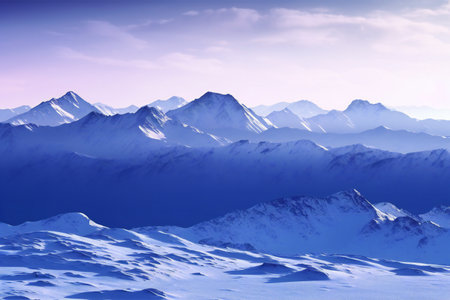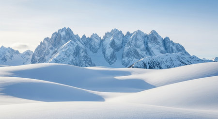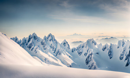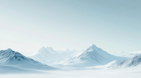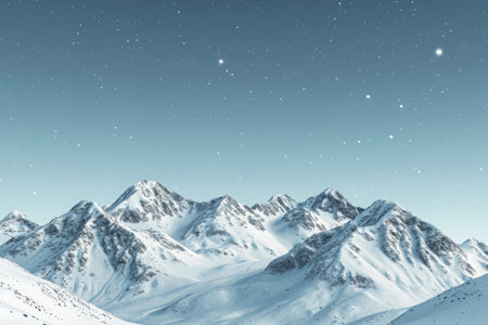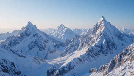 Snow-covered mountain range under a pale winter sky, tranquil and serene alpine landscape scene under a clear blue sky