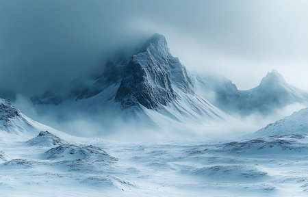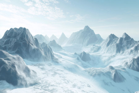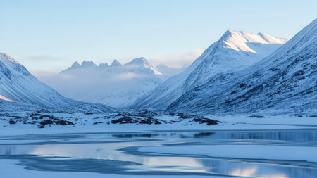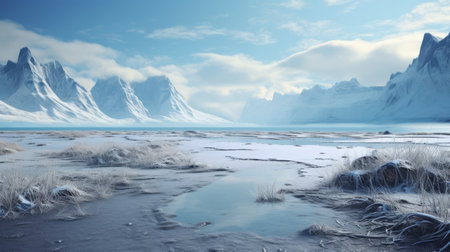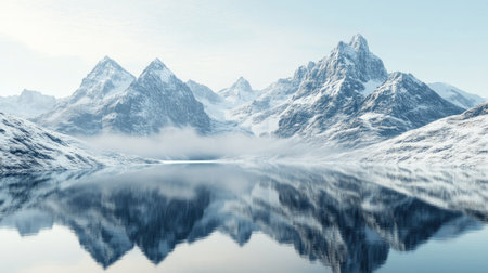 a winter landscape featuring snow-covered mountains and a serene body of water. this hard surface modeling style captures the sensitivity to the natural world, reminiscent of the australian landscape. created using terragen, the soft and dreamy depiction is rendered with accuracy and intricate details in maya. ai generated