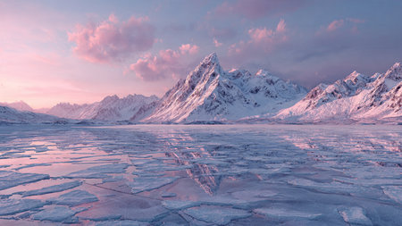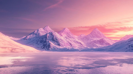 Majestic snow capped mountain peaks against a stunning sunset sky reflecting in the calm waters of a frozen lake This serene and landscape offers a peaceful escape into the remote wilderness