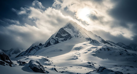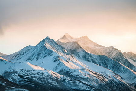 A large mountain, covered in snow, stands tall beneath a cloudy sky, creating a stunning contrast of white and gray, Snow-covered mountain peaks under a pale, winter sunset, AI Generated