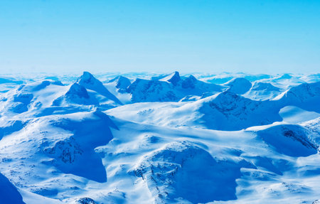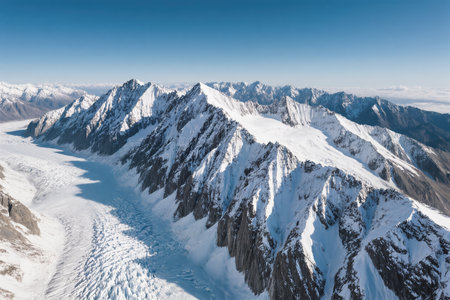 Stunning aerial shot of snow-capped mountains, vast and serene under a bright blue sky.