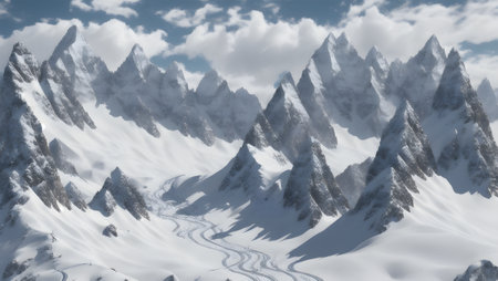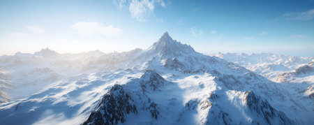 Alpine mountain range blanketed in snow, crisp cold atmosphere.