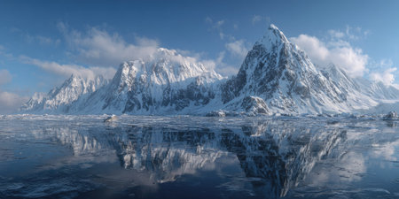 A majestic mountain range covered in snow dominates the scene, reflecting beautifully in a calm body of water. The sky is a clear blue with scattered clouds. This visual could be utilized for various commercial and editorial projects, conveying themes of nature and exploration.