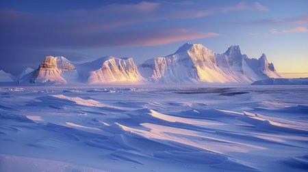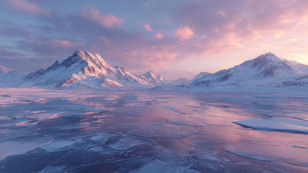 A serene Arctic landscape with a frozen tundra, icy peaks, and a soft pink and blue gradient sky at sunset. The tranquil setting highlights the beauty of polar regions.