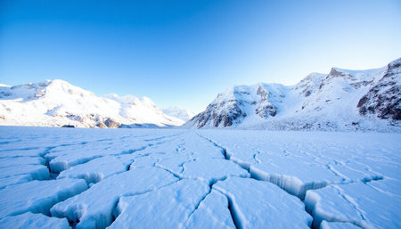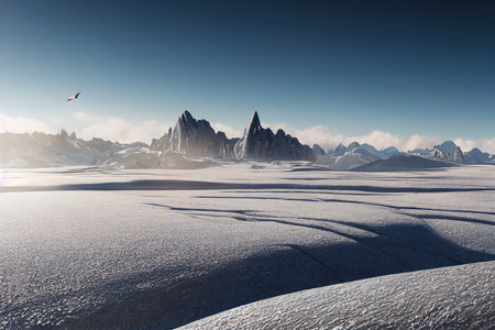Mountains in the winter season with snow and cracks on the ground under a clear blue sky 3d illustration