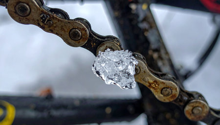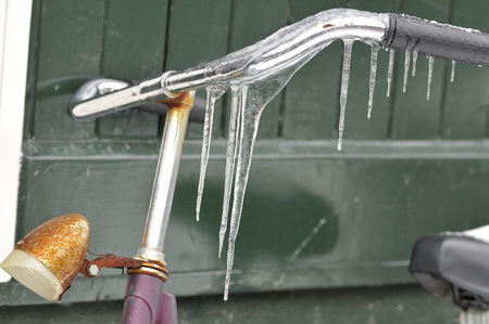 Ice icicles formed on a parked bicycle