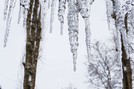 transparent icicles on overcast sky background