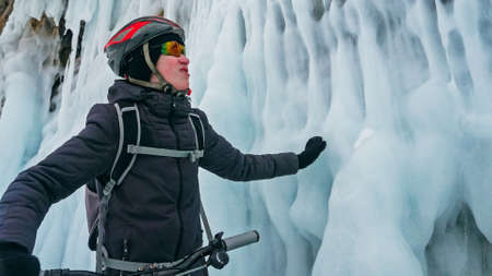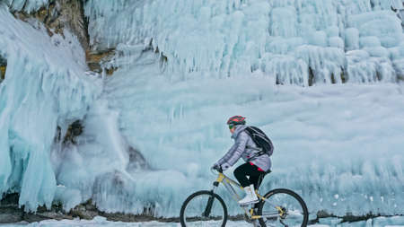 Man is riding bicycle near ice grotto. Rock with ice caves icicl