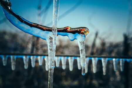Icicles on blue background. Macro photo with shallow depth of field.
