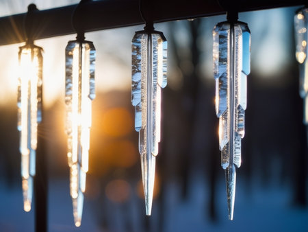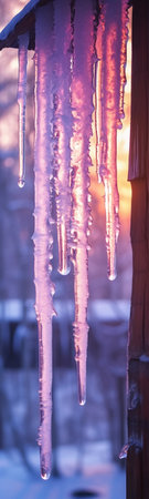 Captivating close-up of icicles hanging from a branch, illuminated by a glowing sunset background with soft bokeh lights, evoking winter's beauty.