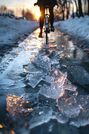 A cyclist rides along a path beside melting ice and snow, reflecting warm sunset colors. The serene atmosphere highlights winter transition into spring.
